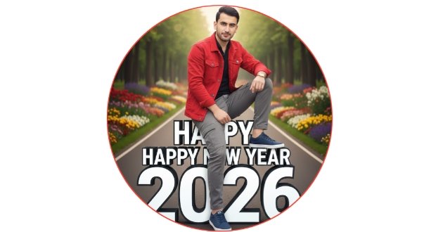 A young stylish man sitting confidently on large “Happy New Year2026” numbers placed on a road in a beautiful park. The numbers have a futuristic black outline. He is wearing a black shirt, red denim jacket, grey cargo, and blue sneakers. The background shows green trees, colorful flowers, and a soft lights. The atmosphere feels modern, cinematic, and positive – symbolizing a fresh new year and new beginnings, ultra realistic, depth of field, perfect lighting.