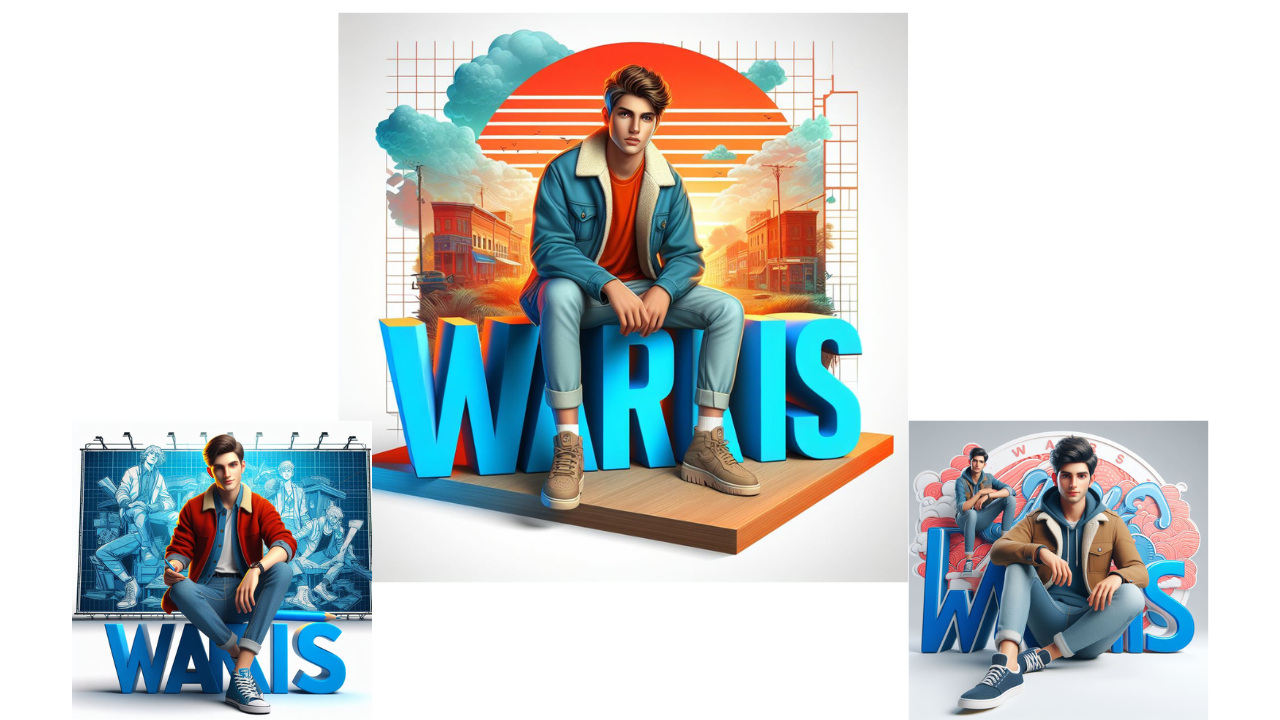 Create a vibrant 3D scene with WARIS and a handsome boy sitting casually on the WARIS large logo. Dress him in trendy casual attire like jeans, a jacket, and sneakers. The background should showcase 3d Scene with WARIS SKILLS in large scale as background and make the Waris spread wide.